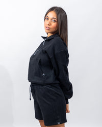 Introducing the Power Half Zip, your go-to hoodie for workouts and everyday comfort. This versatile piece can be worn as a set or on its own, perfect for any occasion. The half zip design allows you to warm up or cool off with ease. The drawstring waist offers a customizable fit, cinch it in for a flattering silhouette or wear it loose for a comfy oversized feel. Made with incredibly soft fabric and featuring a drop sleeve and front pocket, this medium-heavy weight hoodie combines style and convenience.