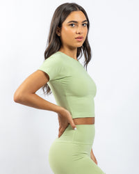 Introducing the Power Crop Tee, made with moisture-wicking fabric, this tee keeps you cool and dry during intense workouts. Engineered with lightweight performance fabric, it offers breathability without compromising comfort. With its soft touch and cropped length, it pairs perfectly with our high-waisted leggings and cycling shorts! You can mix and match between the colors.